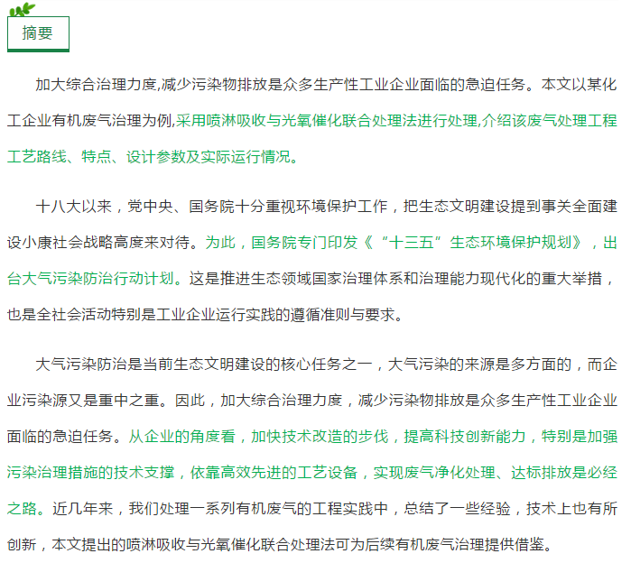 喷淋吸收与光氧催化联合处理法治理化工有机废气工程实例
